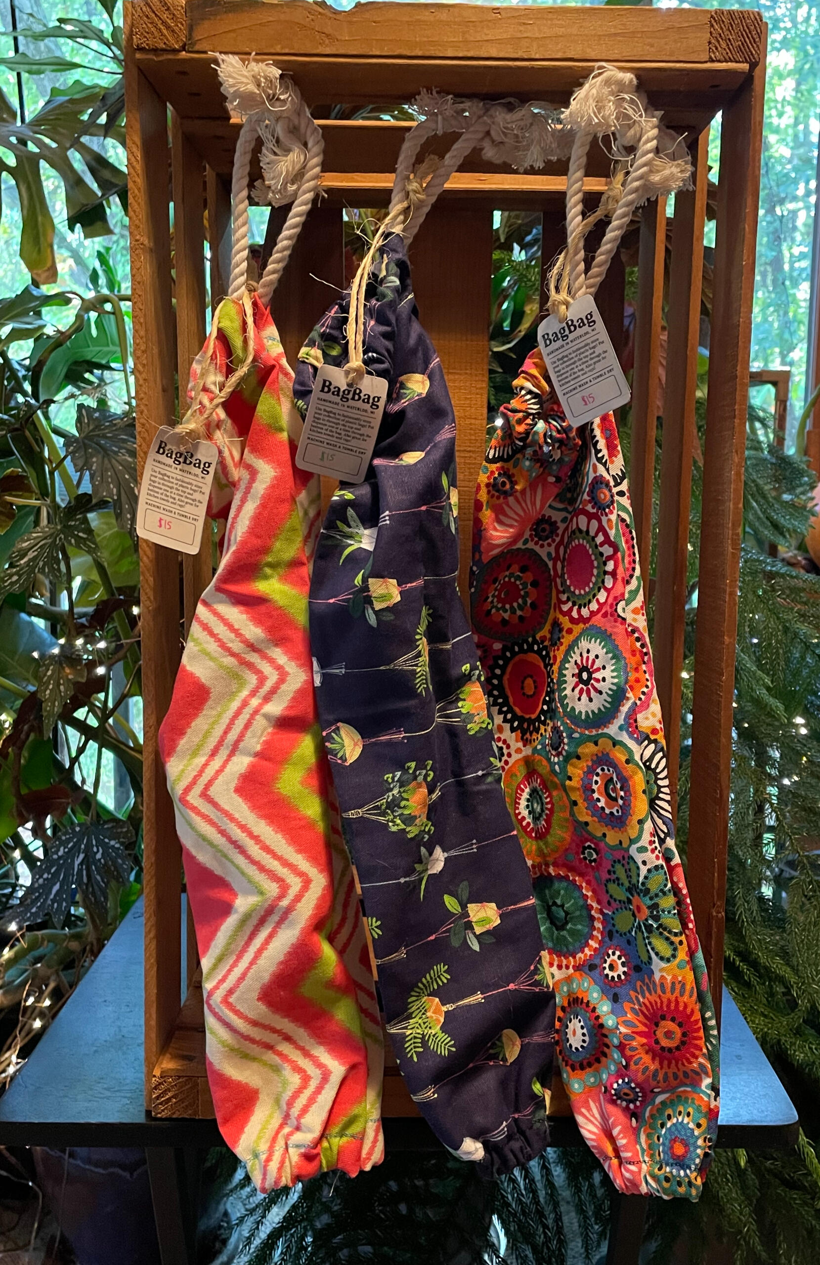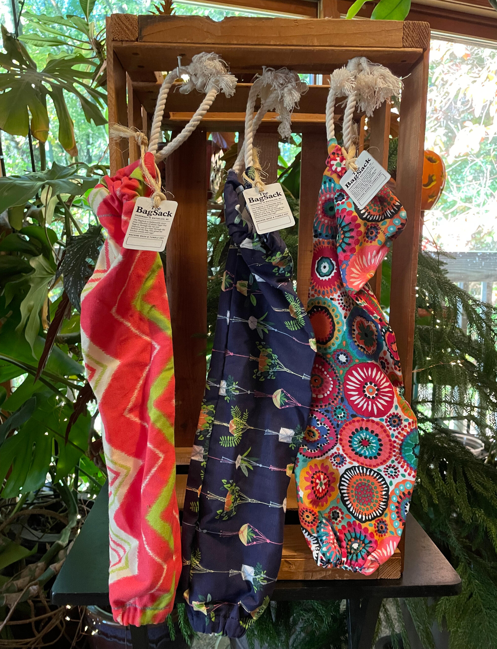 BagSack was created out of necessity when our collection of plastic shopping bags got to be too much to handle. They looked messy, they were falling all over the place, and it just wasn't working for us. One day, a solution came to mind and out came the sewing machine! Within a few hours, the first BagSack was made.Plastic bags go in the top and dispense one at a time out the bottom through the elastic ring. Conveniently hang your BagSack on a hook or doorknob for a fasionable and organized plastic bag storage solution.BagSack is also great for storing kitchen towels and rags!